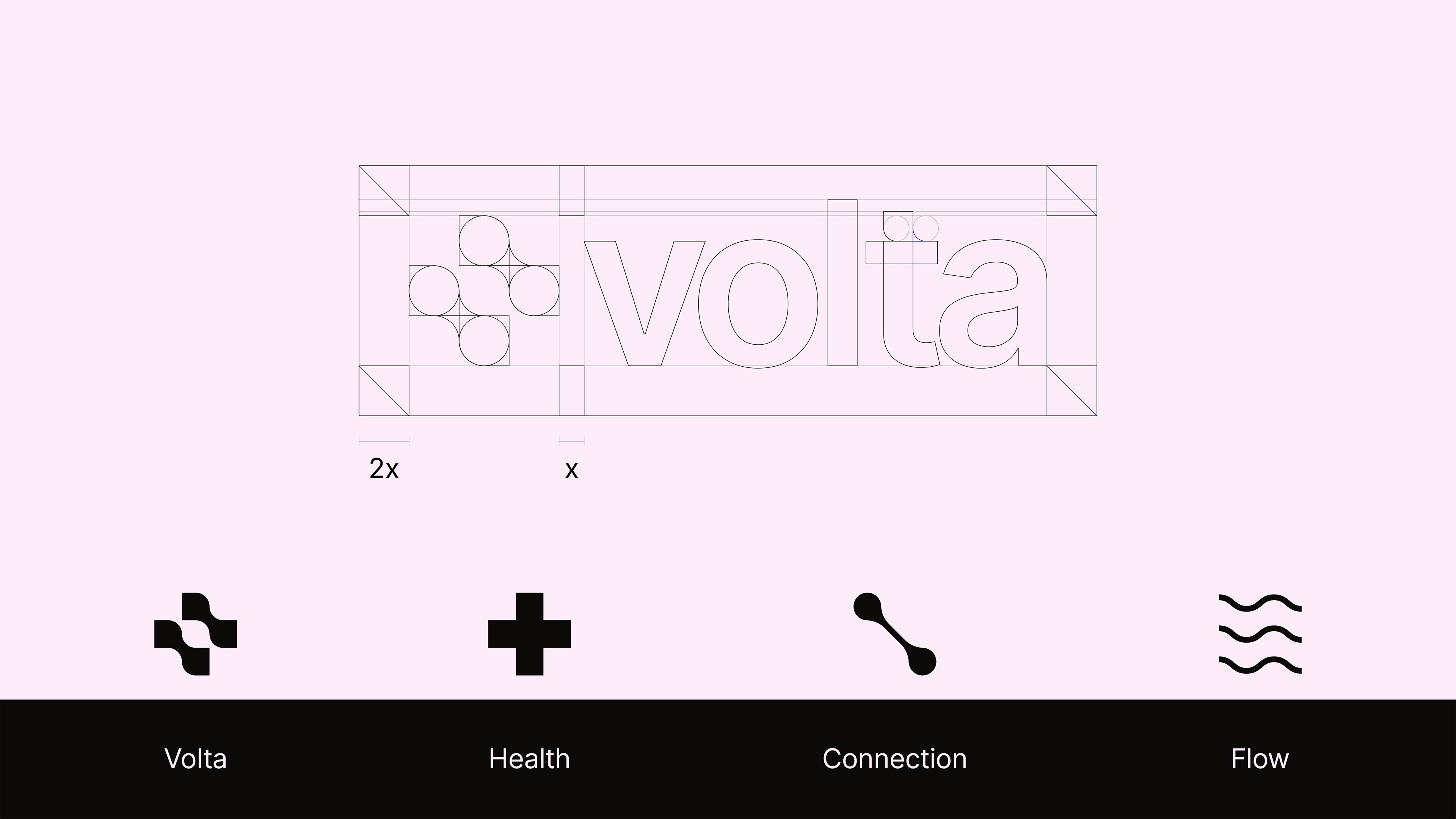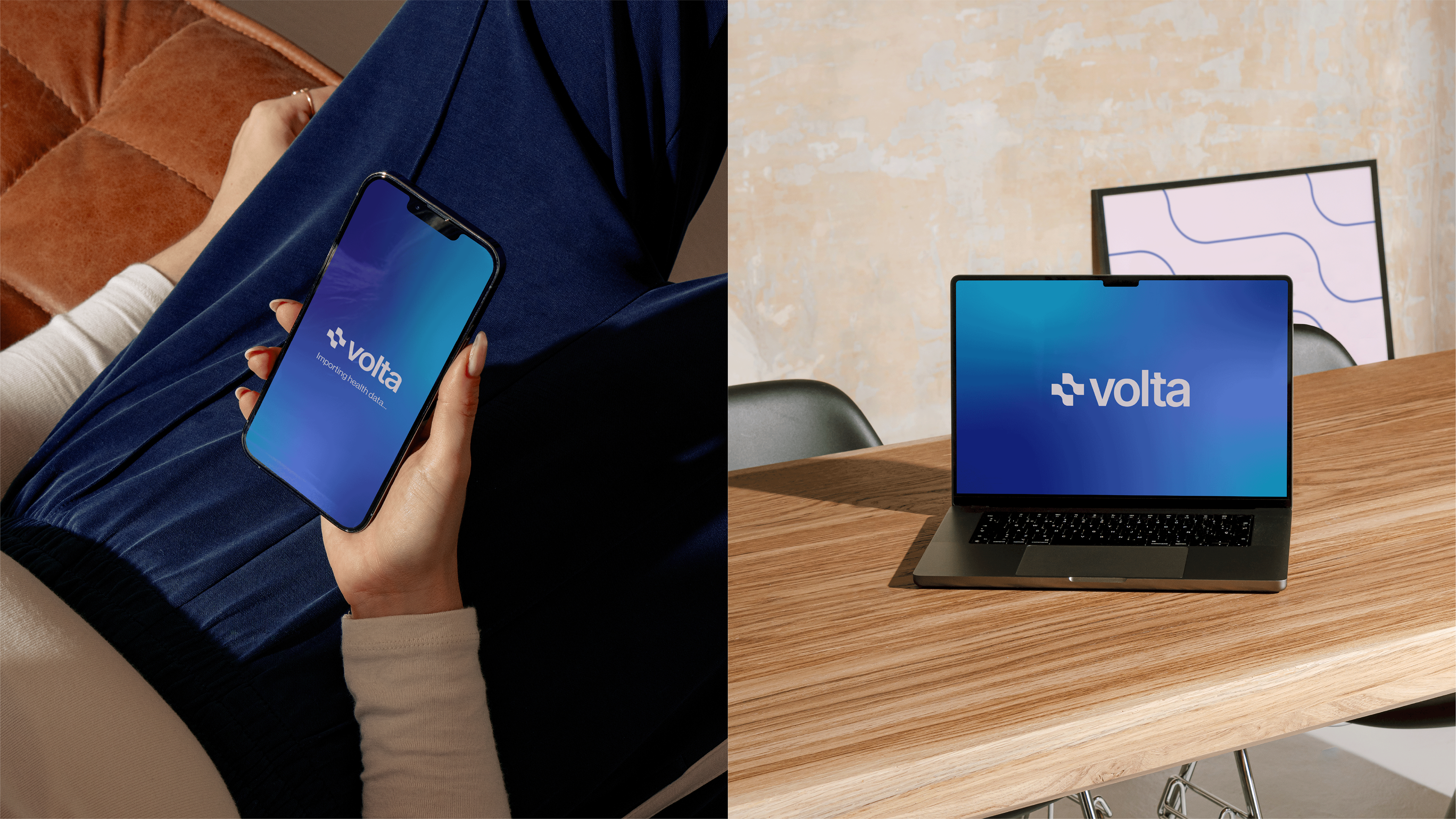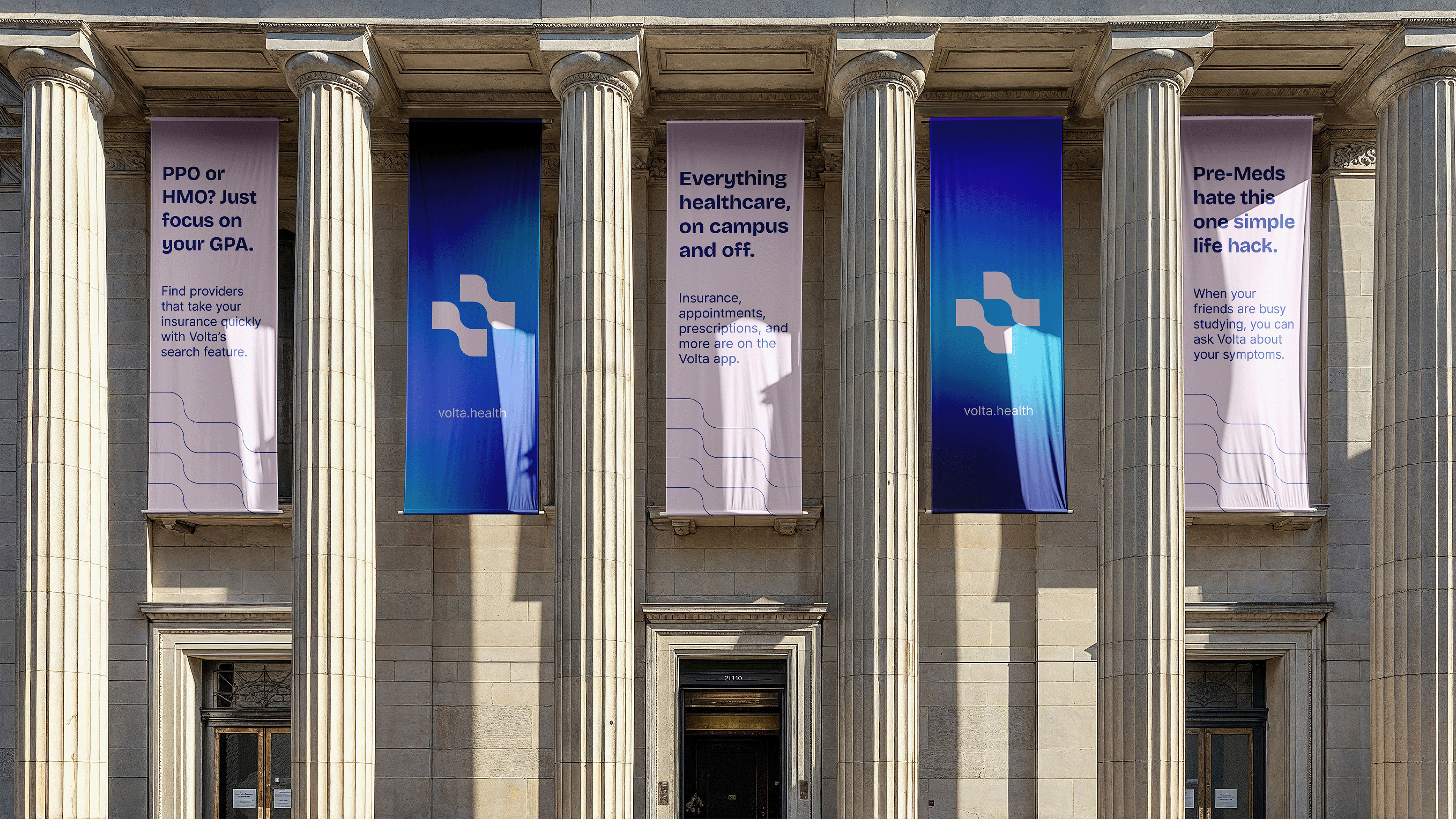 Visual brand identity for Volta, an all-in-one digital health tool for college students, that emphasizes a calm atmosphere, seamless information flow, innovative support features, and the river from which Volta gets its name. The brand's identity was carefully crafted to excel in IRL placements such as billboards and merchandise, as well as within the UI of the product itself.